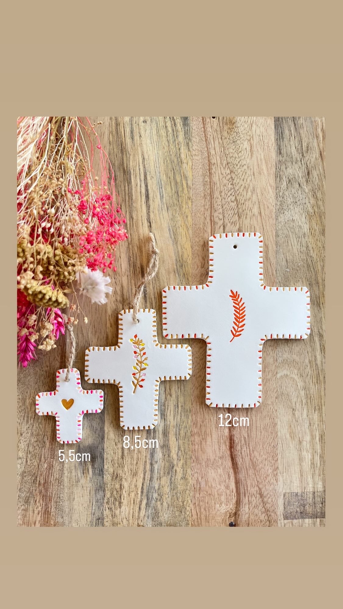 Une jolie croix de 8,5cm en argile personnalisable avec un motif au choix, qui sera dessiné autour de la croix.