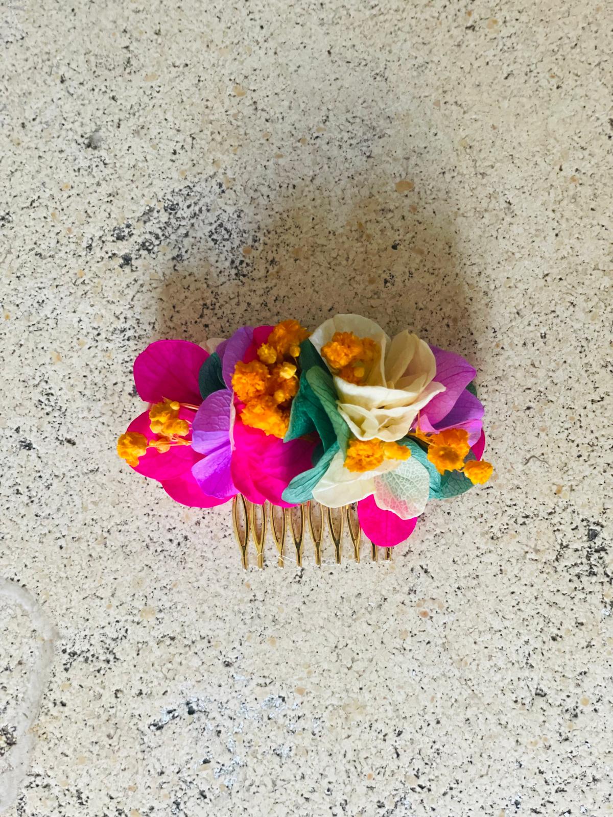 La collection Soltice fleuri propose une collection aux tons fushia, champagne et orangés. Le peigne Soltice fleuri est un accessoire idéal pour ajouter une touche de poésie et de fraîcheur à votre coiffure avec ces tons muliticolores. Le grand peigne mesure 10 cm et le plus petit 6 cm.
